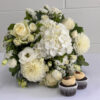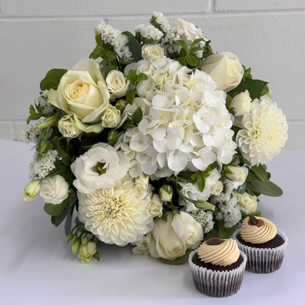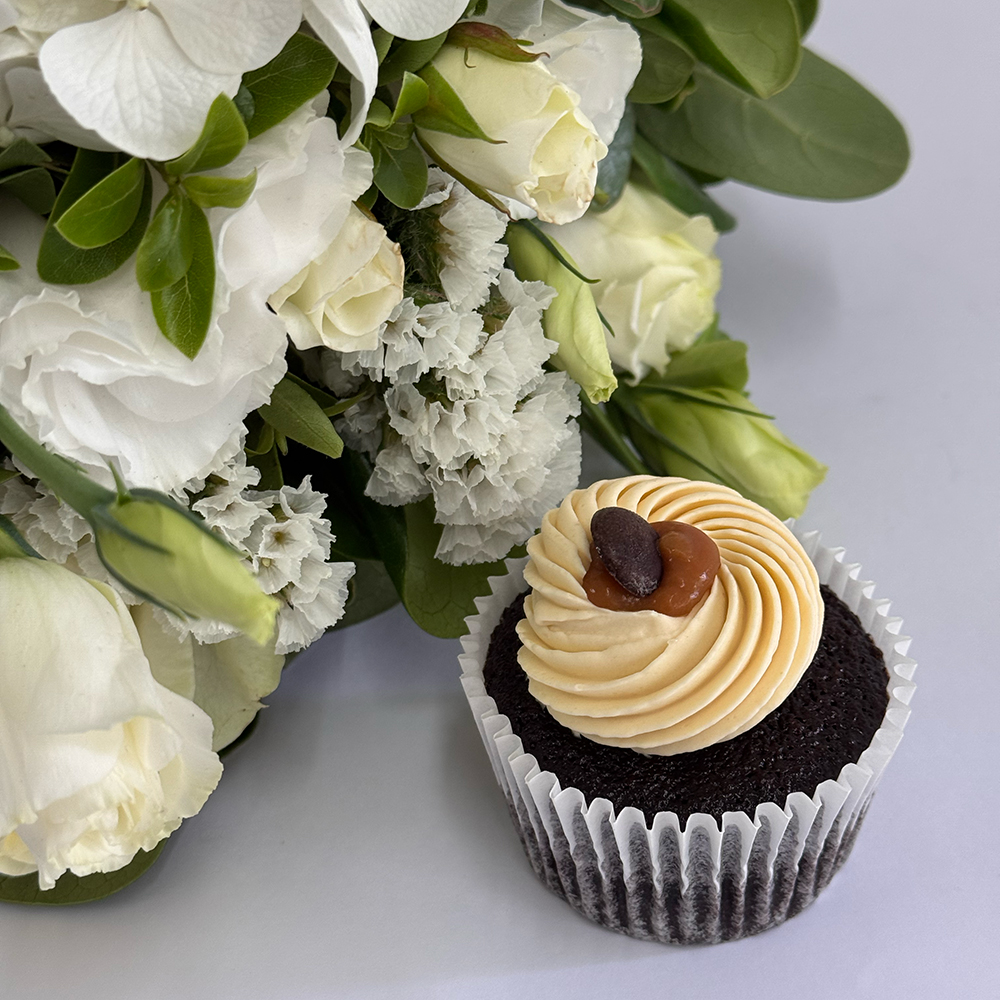 “Blissful Whites” is a serene and elegant arrangement, featuring a soft posy of pure white blooms that radiate tranquility and grace. The delicate flowers are complemented by decadent salted caramel cupcakes, its rich flavor balanced perfectly with a hint of sea salt and smooth caramel frosting. Presented together within a white gift bag, this thoughtful pairing creates a delightful gift, combining the beauty of nature with the indulgence of a sweet treat, ideal for any occasion that calls for a touch of luxury and sweetness.
