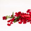 A perfect single Red rose with fresh green foliage presented within folds of white tissue, a white paper wrap and finished with scarlet satin ribbons.