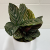 The Calathea Ornata, also known as the Pinstripe Plant, is a striking tropical houseplant admired for its elegant dark green leaves adorned with delicate pale pink stripes. This eye-catching beauty is presented in a matte white ceramic pot, making it a stylish addition to any interior.