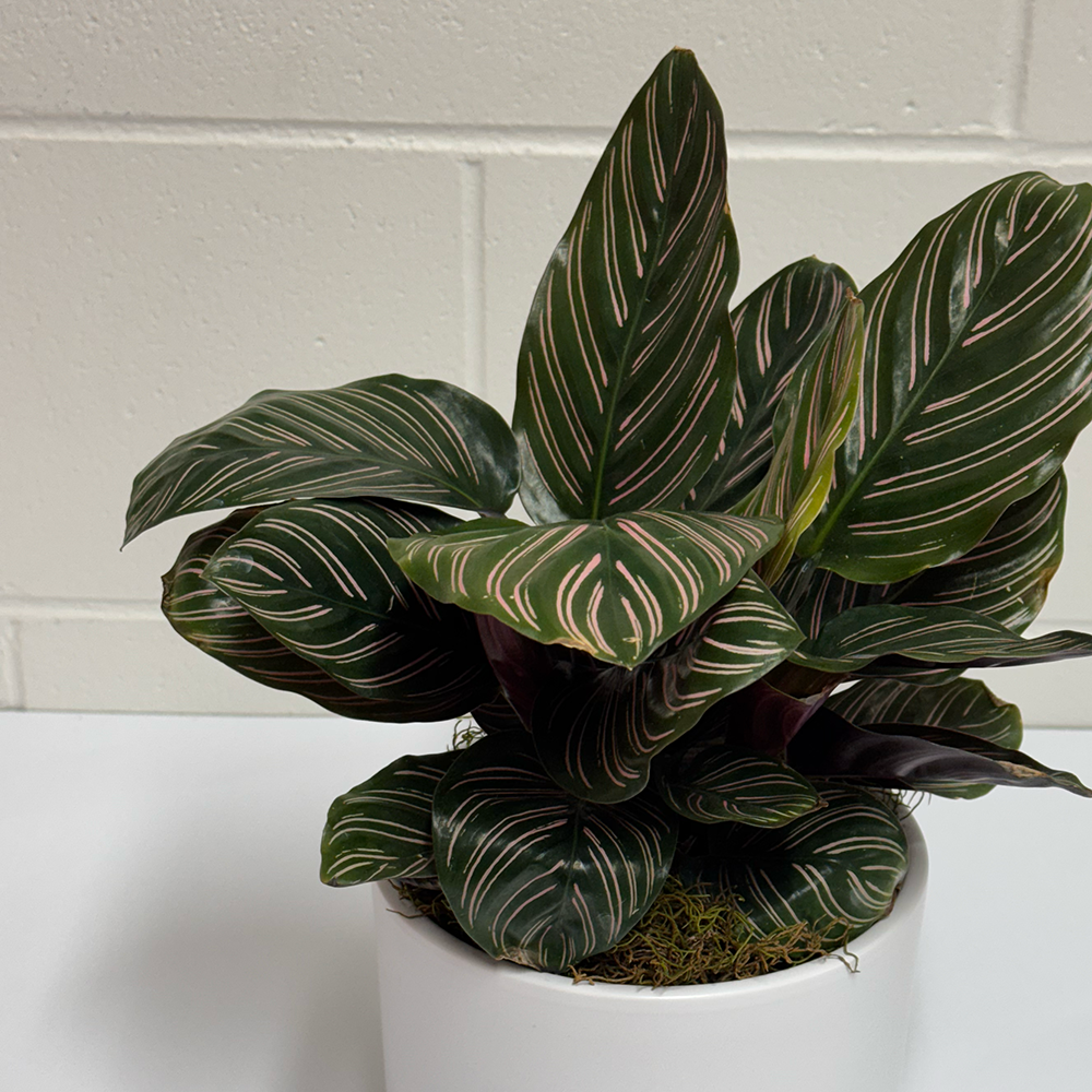 The Calathea Ornata, also known as the Pinstripe Plant, is a striking tropical houseplant admired for its elegant dark green leaves adorned with delicate pale pink stripes. This eye-catching beauty is presented in a matte white ceramic pot, making it a stylish addition to any interior.